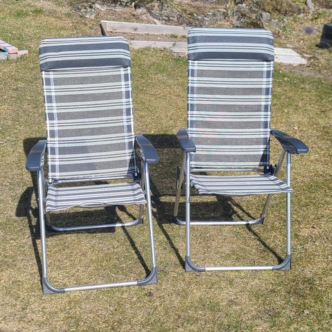 Två hopfällbara campingstolar i grått tyg och armstöd för lata dagar i trädgården eller på campingen. Lätta att fälla ihop och ställa undan när de inte används.
