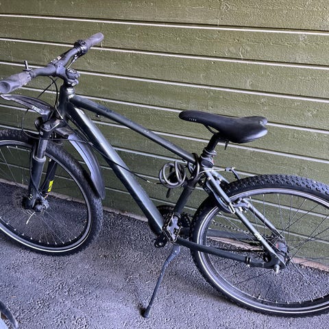 Svart Dacke-cykel med lågt insteg och 26" hjul. Utrustad med pakethållare bak, skärmar och fotbroms.