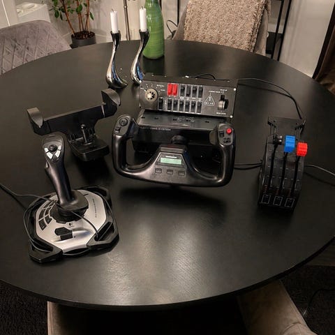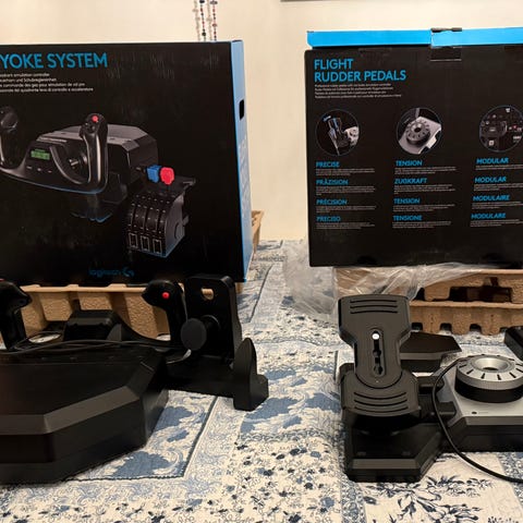 Flight-yoke system från Logitech med flera knappar och reglage. Med separat throttle-enhet med tre spakar och extra knappar för flygsim på dator.