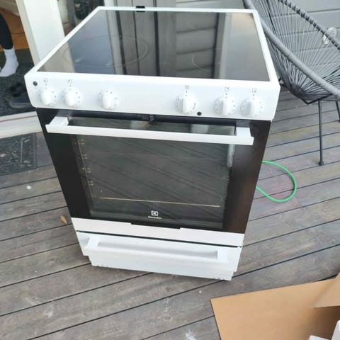 Vit glaskeramikspis från Electrolux med varmluftsugn och stor glaslucka fram. Har flera vred upptill för plattor och ugn samt en praktisk låda längst ner.