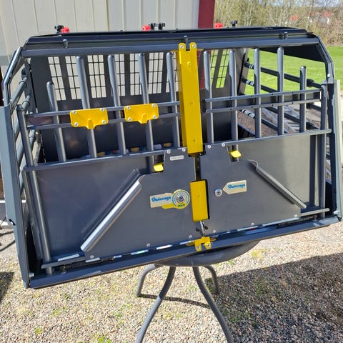 Stadig dubbel hundbur i svart med gula detaljer för bilens bagageutrymme. Galler på sidorna och fram, med låsbar dörr och plan botten som är lätt att hålla ren.