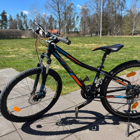 Cykeln är i gott bruksskick och har använts av mig sedan den var ny (ca 2012) och gått ett och annat motionslopp. Bytt till längre styrstam för att passa mig som är 160 cm. En perfekt instegs-cykel för kortare person som vill börja cykla i skogen! Den har en hel del bruksslitage och skulle må bra av en proffs-service, men den funkar fint att köra på som den är.