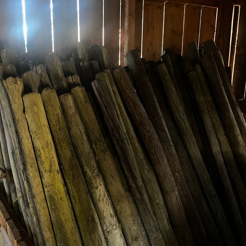 Sju st smedtillverkade låsbommar av hög kvalitet och tjockt gods. Mått enligt bild 135-150 cm i längd och 7 cm i bredd, brytskydd, olika fästanordningar och beslag enligt bild. Utmärkta till sommarstuga, förråd eller annat.