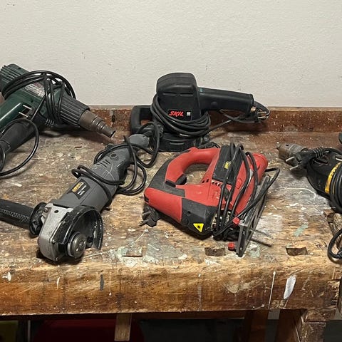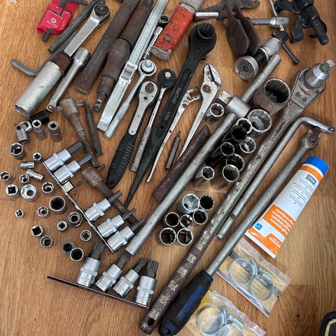 Sats med olika pneumatiska verktyg som tryckluftstillbehör, blästringstillbehör och luftslang. Det följer med flera hylsor och kopplingar som syns på bilderna.