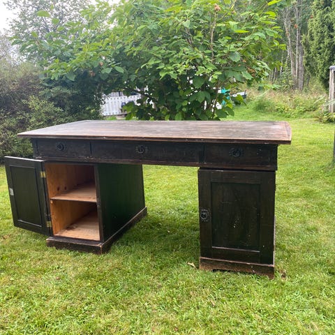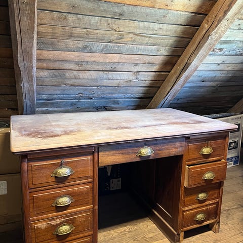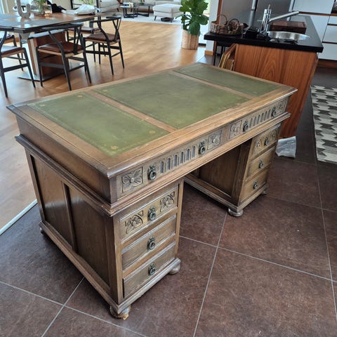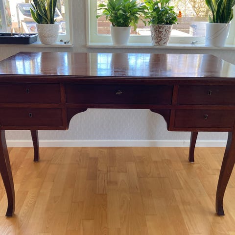 Ett fint skrivbord i jugendstil från det tidiga 1900-talet, troligen tillverkat i ek. Skrivbordet har fem lådor och en glasskiva på toppen.