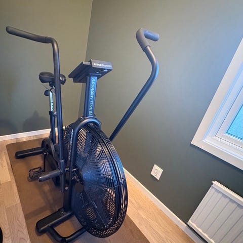 Airbike från Jula, med stort fläkthjul fram. Har justerbart säte, display och rörliga handtag för både armar och ben.