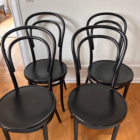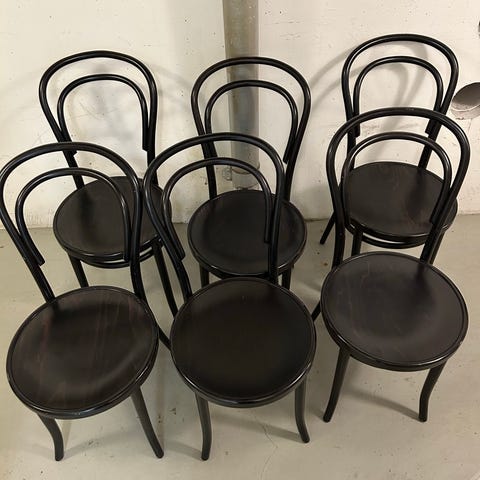 Fem stolar i trä. Okänd tillverkade. Visst slitage på sitsarna men fungerar självfallet att använda som dom är. Lika Thonet.