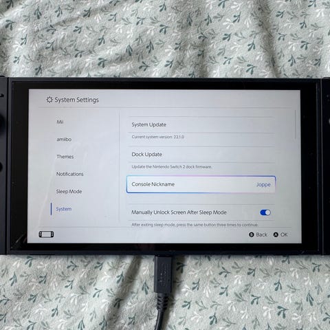 Nintendo Switch spelkonsol i svart med avtagbara handkontroller. Följer med Mario Kart World och originalkartong syns på bilderna. Mario Kart World ingår med Nintendon