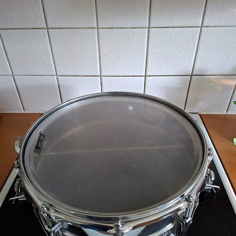 Dw collectors 14x5,5” Marine Pearl från 1995. Den har fått ett nytt uppgraderat MAG strainer system (1200kr) därav är det två små hål (se bild) från på ena sidan från den gamla som hade en andra mått på infästningen. Jag har inte fyllt igen hålen eftersom de syns knappt och gör knappast någon skillnad på ljudet. Det finns en spricka i wrapen (se bild) som enkelt kan lagas av den händige eftersom den är i slutet på längden av wrapen.