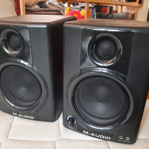 Yamaha aktiva studiomonitorer med vit kon och svart låda, säljes som par. På baksidan finns flera reglage och anslutningar för ljudkällor och justeringar.