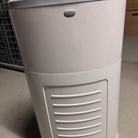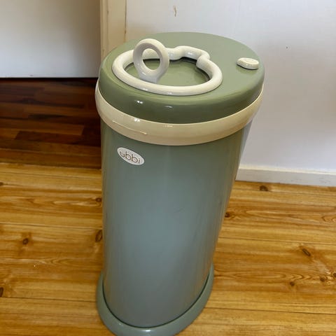 Ubbi blöjhink i vit och grå med chevronmönster. Lock upptill som öppnas med knapp. Bra skick!