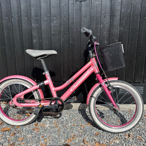Crescent barncykel med 16" hjul i rosa med ljusblå skärmar. Har pakethållare bak, kedjeskydd och fotbroms samt handbroms fram. Ny pris 3800kr.