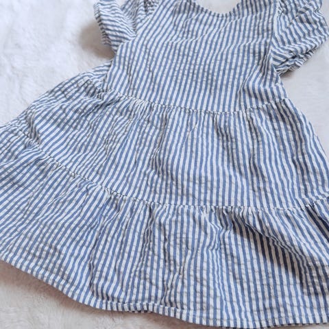 Fin blå- och vitrandig ärmlös klänning från Tommy Hilfiger i mjuk bomull, storlek 140. Knäpps i nacken bak och har en fin volangkjol med flera sydda partier som ger extra rörelse och fall.