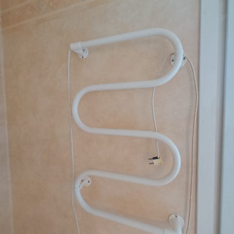Elektrisk handdukstork i krom med flera horisontella ribbor. Har strömbrytare nere på sidan och ansluts med vanlig elkontakt.