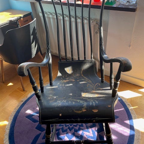 Svart trägungstol med armstöd och svarvade ben, skön att sitta i. Blågrön allmogekista med handmålad dekor och röd insida, märkt ca 1850 under locket.