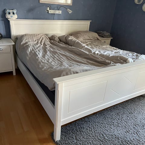 Vit säng från IKEA i storlek 160x200 cm med hög gavel vid huvudända. Stabil träram med klassiska paneldetaljer runt om. Höjd 112 cm i huvudändan och 67 cm i fotändan. Madrass och bäddmadrass ingår och är kategori fast.