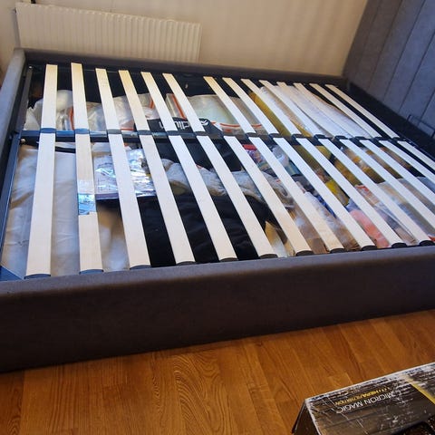 Finns bild på skada längst ned mot golvet, där folien släppt lite på något ställe. Har mest används som gästsäng.