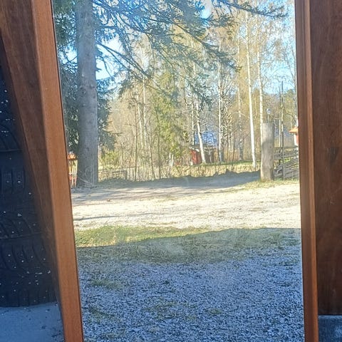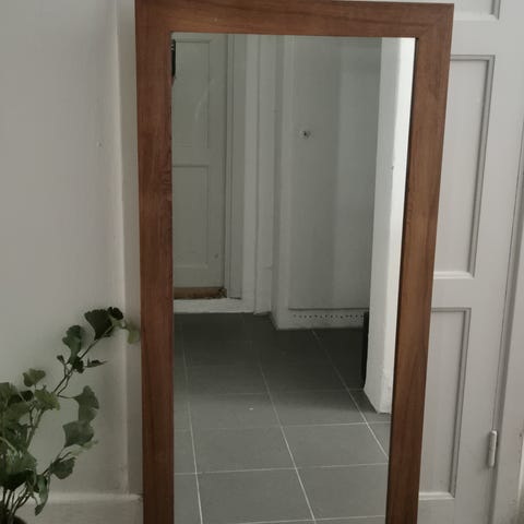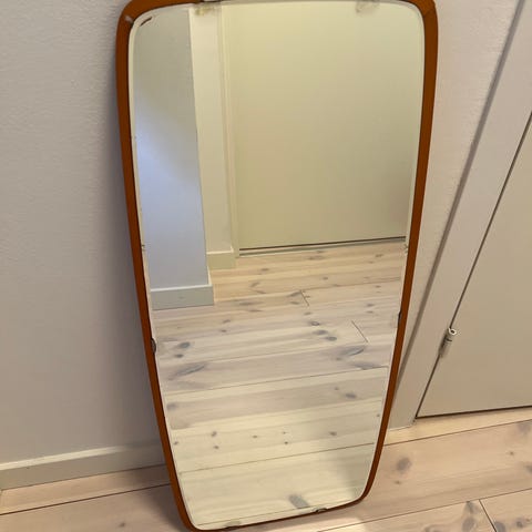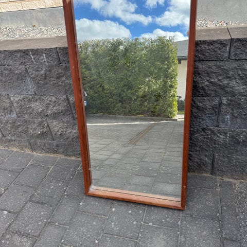 Fin spegel i teak. 86x37 cm. Spegeln måste fästas (finns hållare). Annars i bra skick.