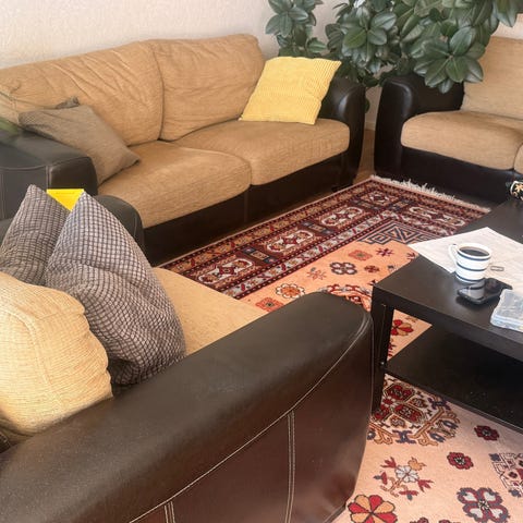 Lädersoffgrupp: 2 tresitssoffor fåtölj ink. soffbord, 2st sidobord + bordslampor