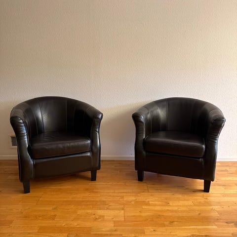 Svart lädersoffgrupp: 2 tresitssoffor + fåtölj från Mio inkl. soffbord, 2st sidobord + bordslampor