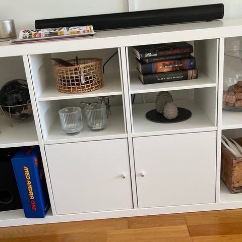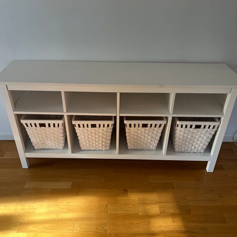 En vit ikea kallax 3x4 med underrede och lådinsatser. Små märken efter användning, men generellt i fint skick. Inköpt för 3 år sen. Vill man bara köpa hyllan med underede så kostar den 1000 kr.