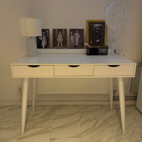 Vitt skrivbord/sminkbord från IKEA med extra glasskiva som toppskiva. 2 lådor.