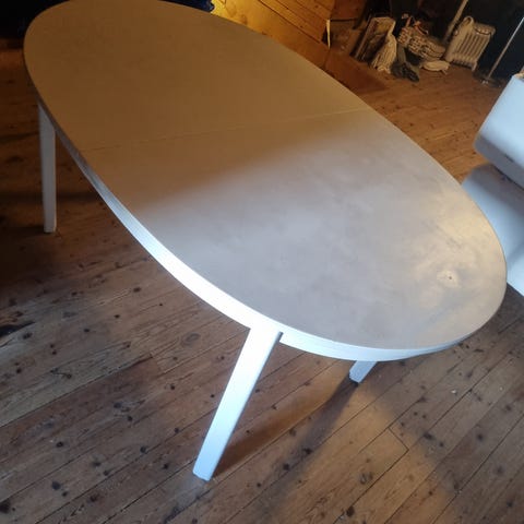 1.- IKEA matbord i rund modell. Bordet är vitt och har fyra raka ben. Skivan är delad i mitten vilket kan tyda på möjlighet till iläggsskiva, men iläggsskiva syns inte på bilderna. Undersidan visar en enkel trä- och skivkonstruktion med metallbeslag. Passar som matbord eller köksbord i exempelvis kök eller mindre matplats. 1 400KR