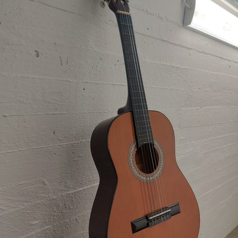 Klassisk akustisk gitarr från Alhambra i naturträ med nylonsträngar. Med följer ett hårt fodral med bärhandtag och dragkedja runt om.