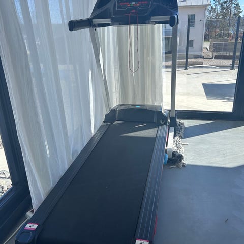 Löpband från LifeGear i svart med grå detaljer. Har display med knappar på handtaget och säkerhetsklämma på panelen. 0-12 km/h, mäter tid, hastighet, distans och puls. Smart hopfällningsfunktion.