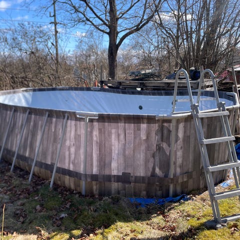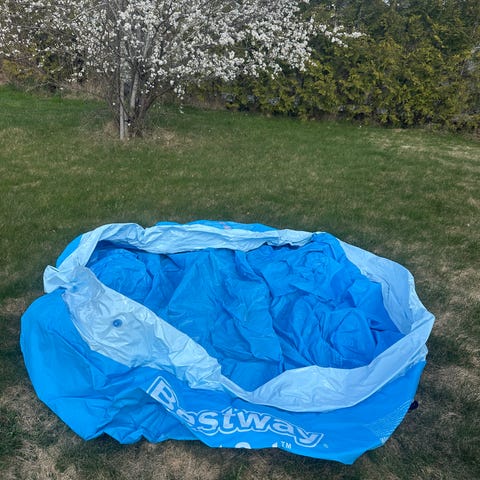 Uppblåsbar barnpool med genomskinliga kanter och färgglada djurmotiv runt om. Blå botten i plast som är lätt att torka av efter användning.