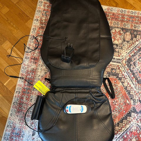 Massagedyna från OBH Nordica för rygg, med fjärrkontroll och elsladd. Fästs med remmar runt stolen och har en grå mittdel i sitsen och ryggen. 4 program för delar av ryggen samt hela ryggen med värme.