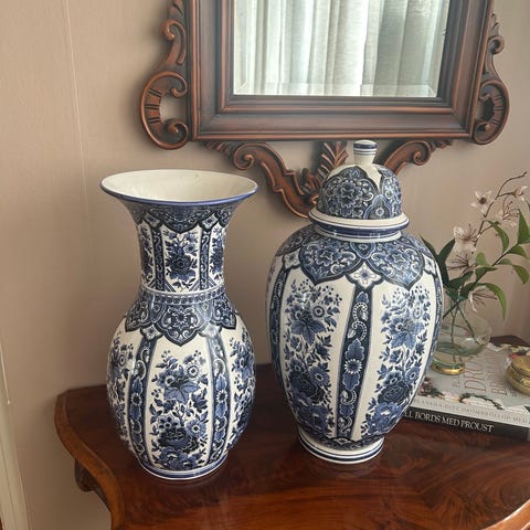 Stor blåvit porslinsvas med blommotiv och fågelmotiv på sidorna. Har bred öppning upptill och klassisk form som syns på bilderna. 50 cm hög