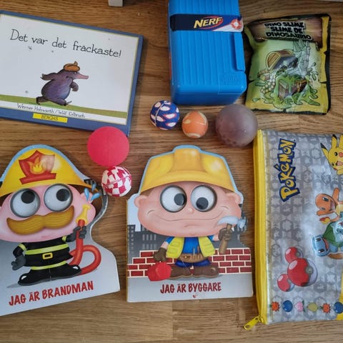 Bland annat olika sorters bilar, Transformers, mini-Pokemon, hörlurar, Loom band verktyg