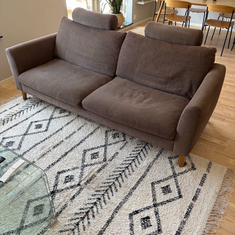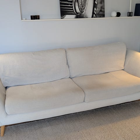 Mios soffmodell Madison armstöd A, avtagbar och tvättbar klädsel. 3 sits. Ekben. Ryggplymåer i dun. Inga skador på tyget. Djur och rökfritt hem.