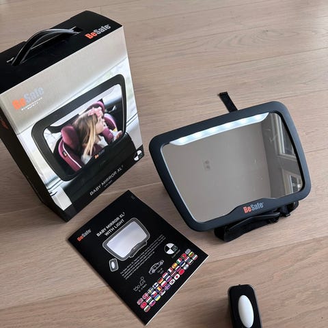 Bilspegel från Fillikid i svart ram som fästs med justerbara remmar runt nackstödet. Bra för att kunna se barnet i bakåtvänd bilbarnstol under färd.