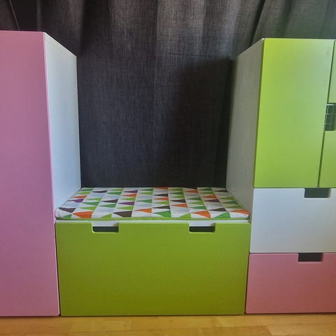 IKEA garderobsskåp stuva i rosa, grönt och vitt med flera hyllplan och klädstång. Är 6 lösa sektioner så man kan anpassa de hur man vill. Kommer från rökfritt hem.