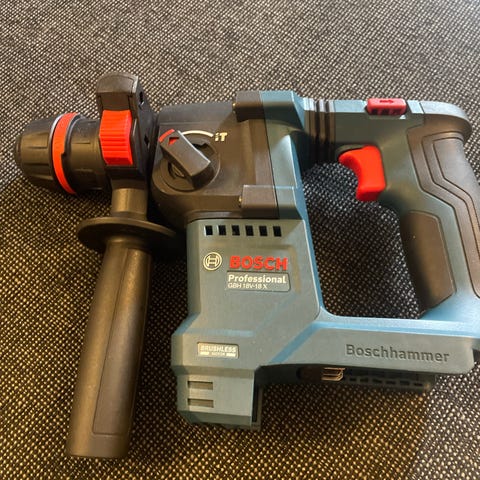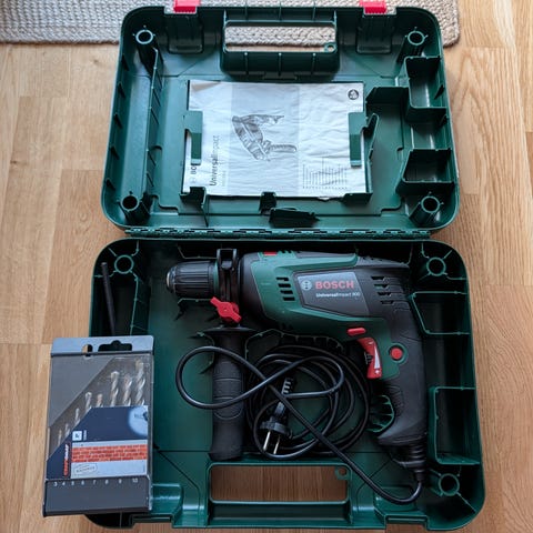 Bosch Professional batteridriven slagborrmaskin med bekvämt handtag och tydliga reglage. Följer med ett set Bosch-borrar i olika storlekar som syns på bilden.