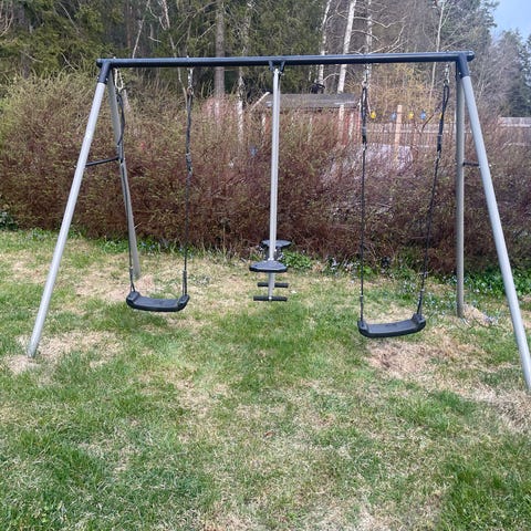 Gungställning i trä som har ett antal år på nacken. Fungerar men renoveringsbehov rekommenderas för att stärka upp den övre balken. Tvillinggungan i fint skick. Total höjd ca 188cm. Den som hämtar monterar ner ställningen.