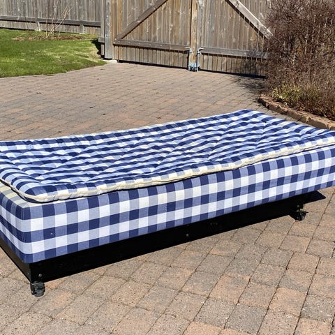 Hästens ställbara säng med klassiskt rutigt tyg och fjärrkontroll för att höja och sänka huvud- och fotända.