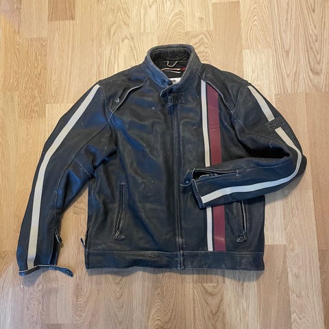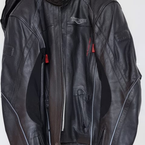Triumph mc-jacka i stl M. Har skydd i axlarna, vid armbågarna och ryggskydd som kan tas bort.
