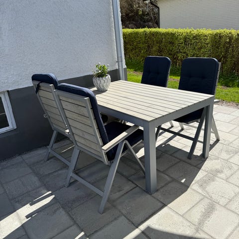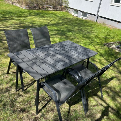 Utebord med 4 stolar i metall grå