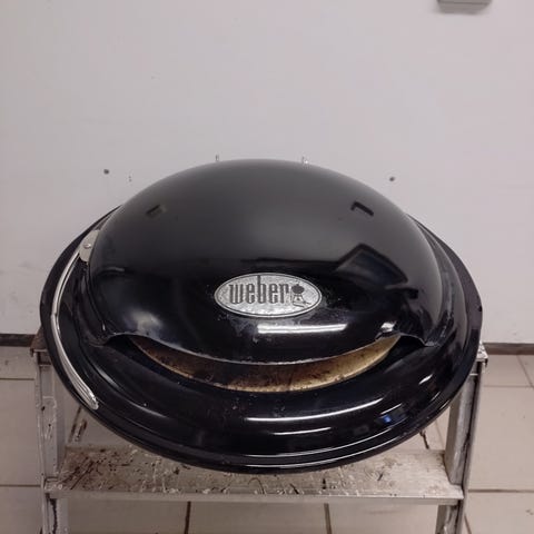 Weber klotgrill i svart med praktiskt sidobord på hjul.