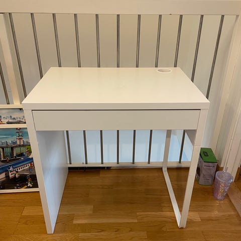 Två st Ikea skrivbord för barn samt en leksakslåda som passar under. Två små stolar. Allt i bra skick, med mindre märken. Fronten på leksakslådan är tydligt använd och behöver målas om.