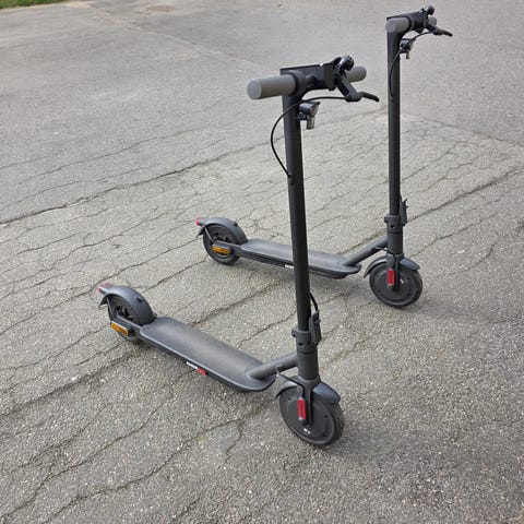 Ninebot F2 Pro elsparkcykel i svart med orange detaljer. Har display på styret och kraftiga däck som syns på bilderna.