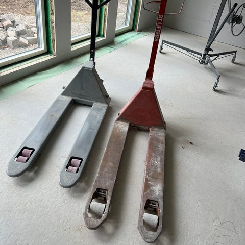pallyftare, palldragare eller gaffelvagn, märkt med "STOCKA".