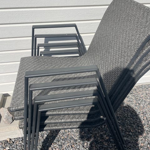 Balkongset med runt bord och fyra svarta stolar i metall och nät. Smidigt och bekvämt set som tar liten plats på balkongen.