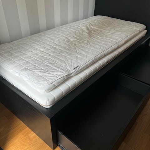 Två IKEA sängbottnar, 90 cm breda vardera, som står på metallben. Beige tyg runt om med svart ovansida, säljs tillsammans som en dubbelsäng.