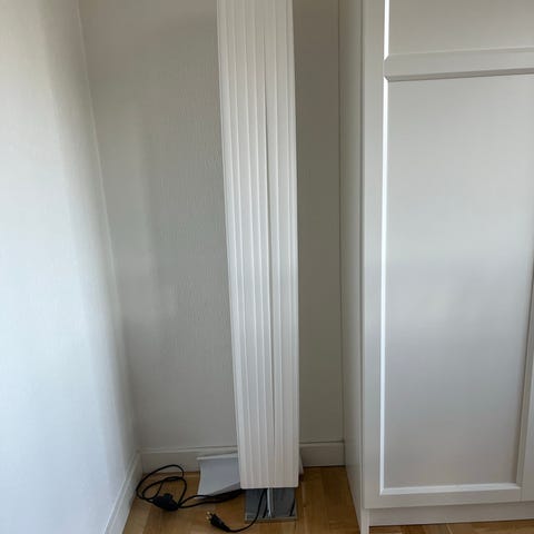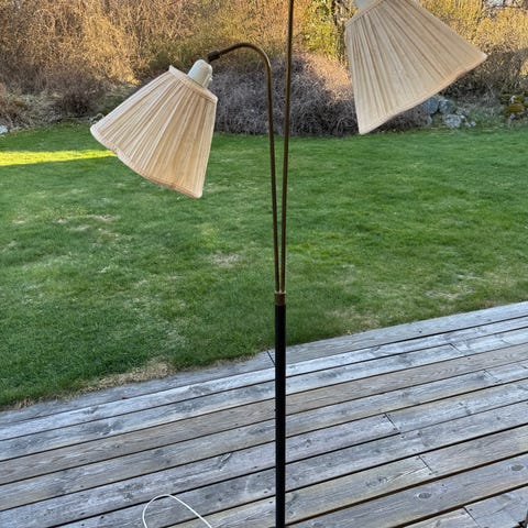 Golvlampa från IKEA med tre vita tygskärmar och svart stativ. Drivs med sladd och har strömbrytare nere vid foten. som ny