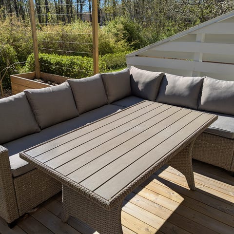 Soffa i rotting med beigea dynor. Soffan består av flera moduler som kan arrangeras efter önskemål. Varje modul har inbyggd förvaring under sitsen. Perfekt för uteplatsen eller balkongen.