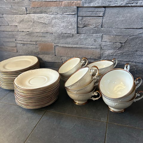 Kaffeservis med 13 kaffekoppar, kaffekoppsassietter och tårtassietter. Elegant design, knappt använd.